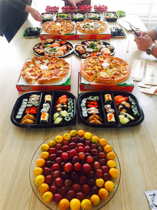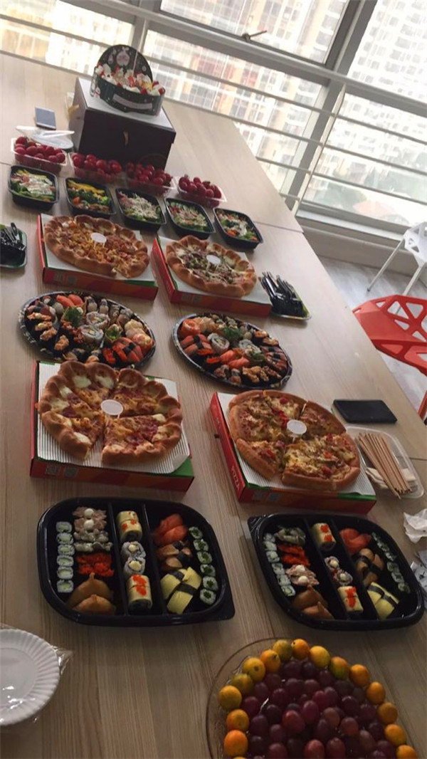 精致可口的壽司,造型可愛(ài)的蛋糕,新鮮出爐的披薩,干凈清爽的水果,各種美味應(yīng)有盡有。為了應(yīng)景,我們的生日蛋糕也特意做成了圣誕節(jié)的造型,給大家?guī)?lái)了滿滿的節(jié)日祝福和氛圍。所有的美味都已準(zhǔn)備好, 就等著我們12月的壽星前來(lái)慶祝,作為2016年的收官之作,各種美味的食物也得到了小伙伴的一致好評(píng),相信2016年許下的愿望明年也都會(huì)實(shí)現(xiàn)。
