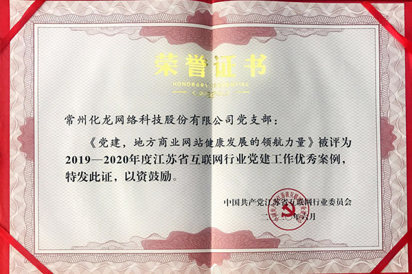2020年6月1日,化龍網(wǎng)絡(luò)黨支部被中國(guó)共產(chǎn)黨江蘇省互聯(lián)網(wǎng)行業(yè)委員會(huì)評(píng)為“2019-2020年度江蘇省互聯(lián)網(wǎng)行業(yè)黨建工作優(yōu)秀案例”