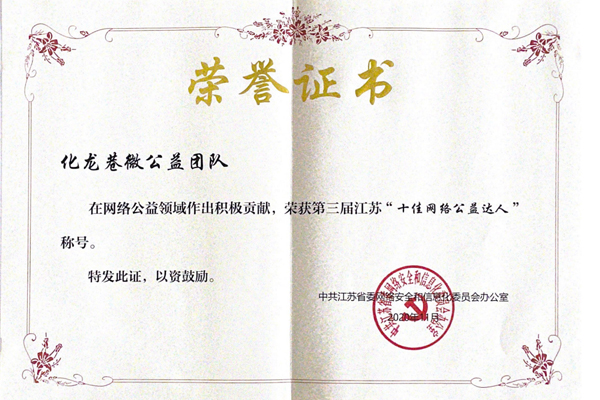 2020年11月1日,化龍巷微公益團(tuán)隊(duì)被中共江蘇省委網(wǎng)絡(luò)安全和信息化委員會(huì)辦公室評(píng)為“第三屆‘江蘇十佳網(wǎng)絡(luò)公益達(dá)人’”