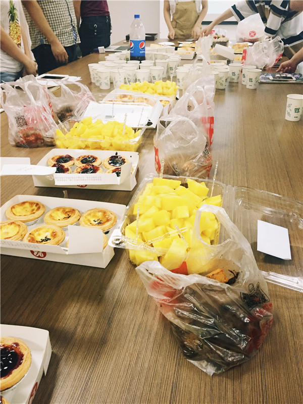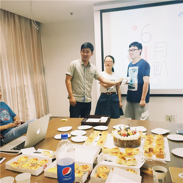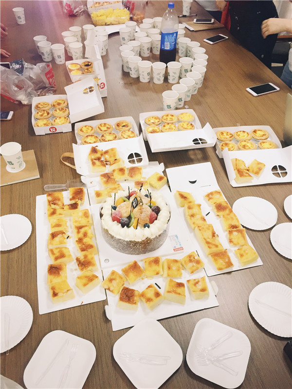 六月份過集體生日趴的有我們千帆王靖 蔣婷,吳彬 和航加馬宇澤 薛舟宇共5位壽星,公司貼心的為本月份生日的壽星們集體舉辦一次生日派對,并為他們準備了明媚豐富的生日驚喜。有蛋糕,蛋撻,各類水果和飲料,我們細心的行政部還做了各種好看的造型。